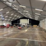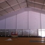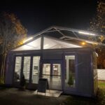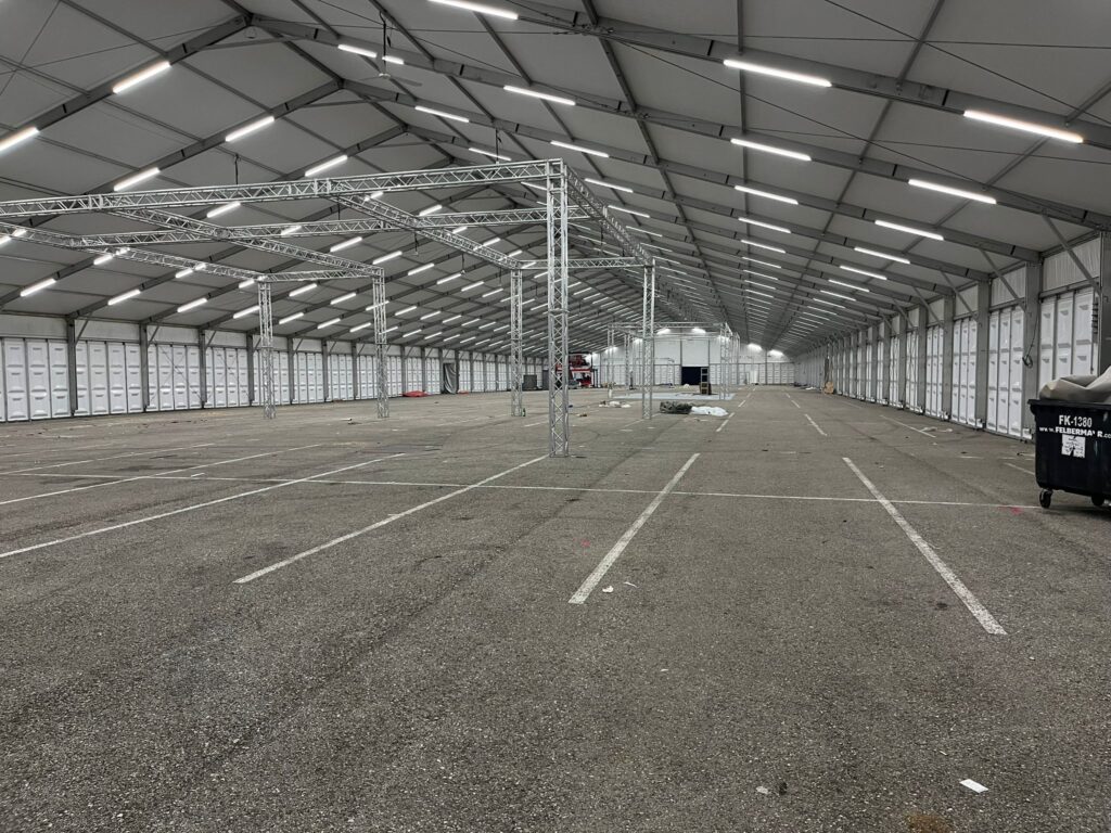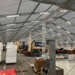 Das vorinstallierte und fertig verkabelte LED- Beleuchtungssystem in den Riegelhohlprofilen der Binderträger mittels modernster und energiesparender LED- Langfeldleuchten (wasser- und staubdicht, Schutzklasse I) mit sämtlichen Verbindungskabeln an der Traufe verlegt, sorgt für eine sehr helle und direkte Grundbeleuchtung der Zeltanlage! Stromanschluss 220V an bauseitigem Verteilerkasten! Eine aufwändige, nachträgliche Lichtinstallation ist nicht notwendig!
