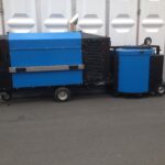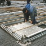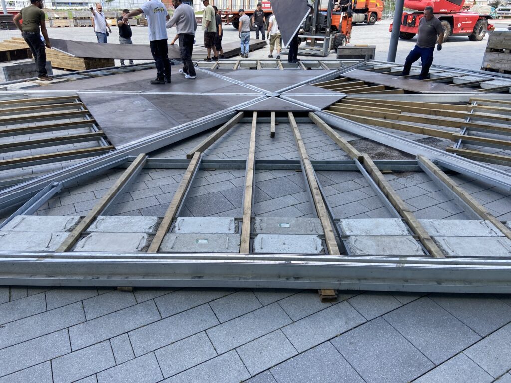 Zug- und druckfester, feuerverzinkter Stahlrohrunterbau und Ringbalkensystem mit Kantholzbalkenlage und integriertem Alu- Kabelkanal (Schienenbalken) in B- Pfosten- Achse, zur Verlegung von Versorgungsleitungen (Wasser, Strom, etc.) “im Fuboden” sowie mit Abdeckleiste zur Verriegelung der Fußbodenplatten für eine ebene und stolperfreie Fußbodenfläche, Holzart: kreuzweise 12-fach verleimte Birke- Siebdruckplatten (21mm), Plattengröße: 4x1m, Farbe: dunkelbraun, Platten stirnseitig mit Alu- Profilen eingefasst, Fußbodenbelastbarkeit: 800 – 1.000 kg/m², ballastierungsfähig